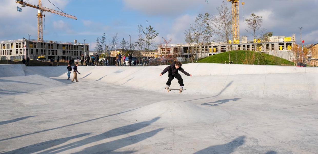 A neighborhood in Høje Taastrup, west of the Danish capital Copenhagen, has a park area. The concept was to create the world’s longest playground with various activities, a skate track being the main attraction.