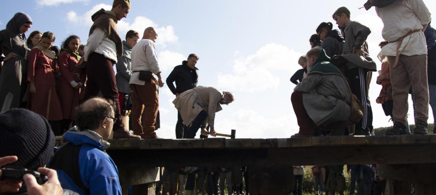 The 700-metre oak bridge is located by a small recreated Viking Age village near the Copenhagen suburb of Albertslund, connecting a reconstructed Viking Age village (Vikingelandsbyen i Albertslund) with an archaeological Viking Age grave site, Snubbekorsgård Gravplads.